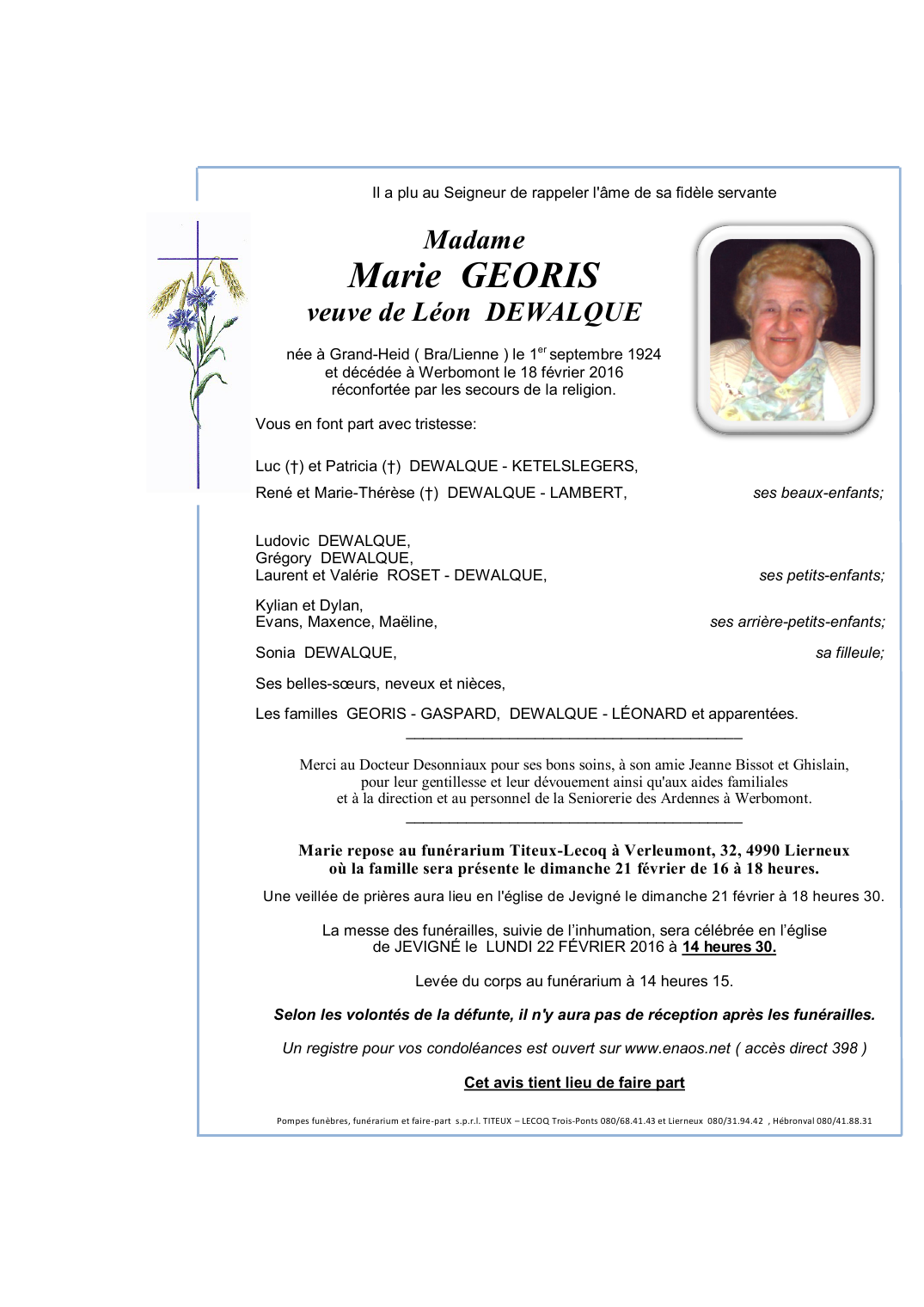 Fallecida en Werbomont (4190) el jueves, 18 de febrero de 2016 a la edad de 91 años