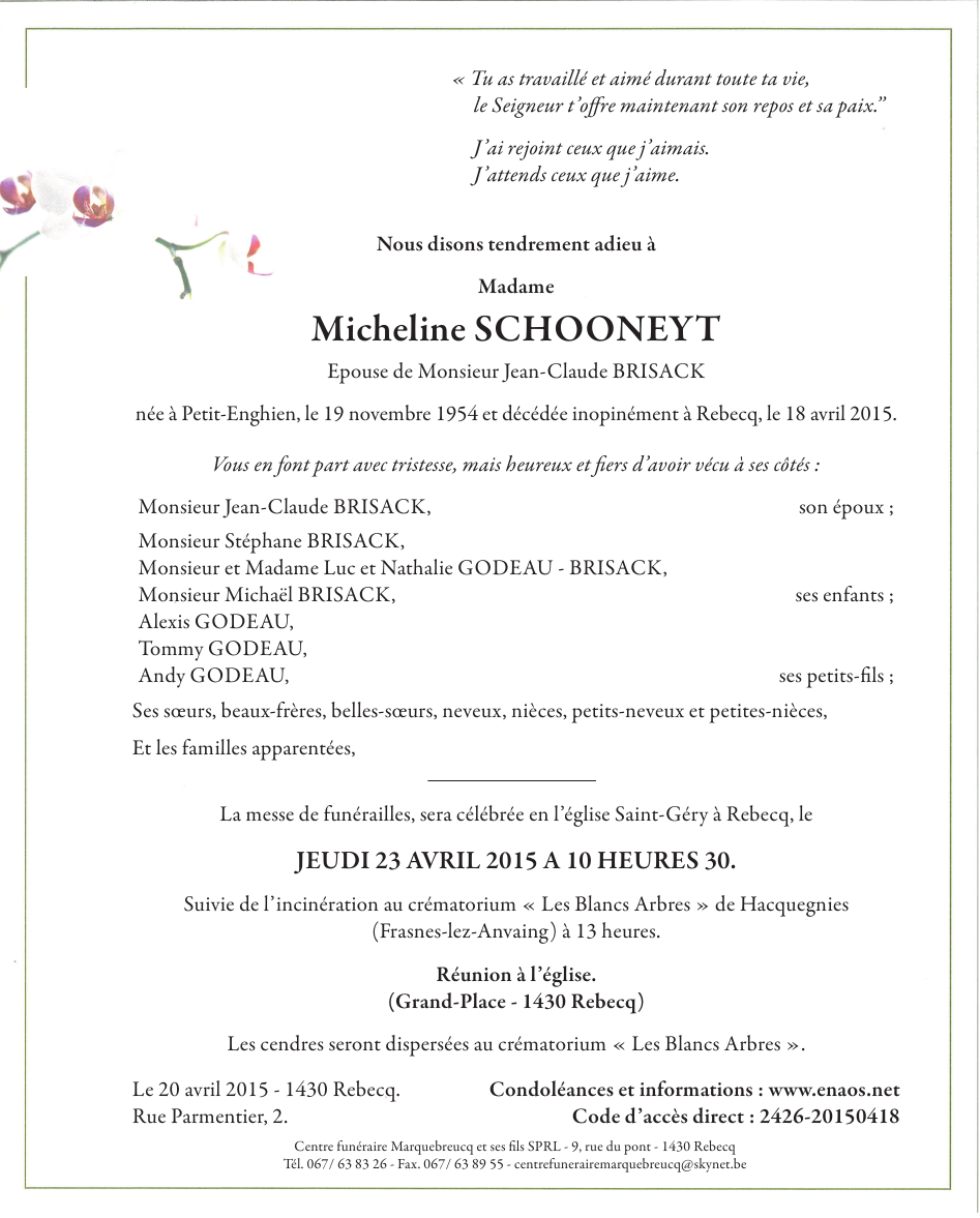 Fallecida en Rebecq (1430) el sábado, 18 de abril de 2015 a la edad de 60 años