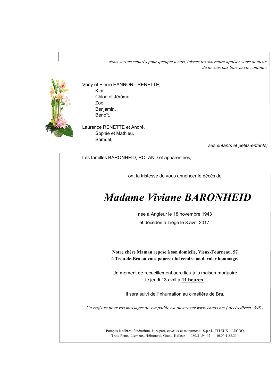 Fallecida en Liège (4000) el lunes, 10 de abril de 2017 a la edad de 73 años