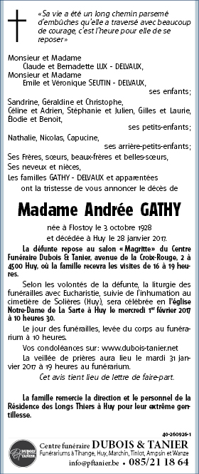 Décédée à Huy (4500) le samedi 28 janvier 2017 à l'âge de 88 ans