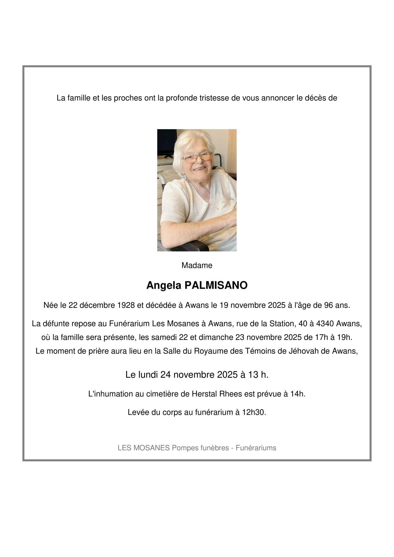 Overleden te Awans (4340) op woensdag 19 november 2025 op 96-jarige leeftijd
