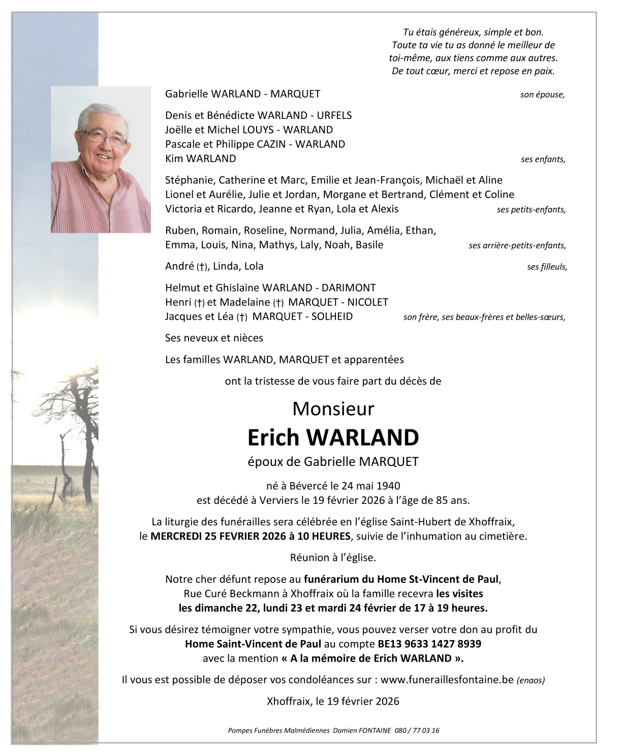 Fallecido en Verviers (4800) el jueves, 19 de febrero de 2026 a la edad de 85 años