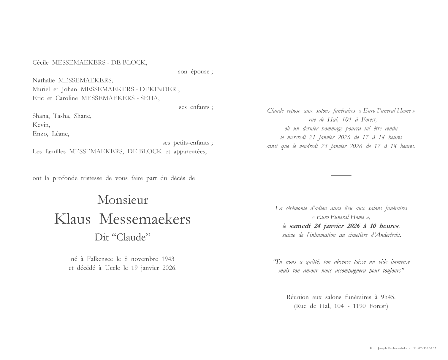 Décédé à Uccle (1180) le lundi 19 janvier 2026 à l'âge de 82 ans