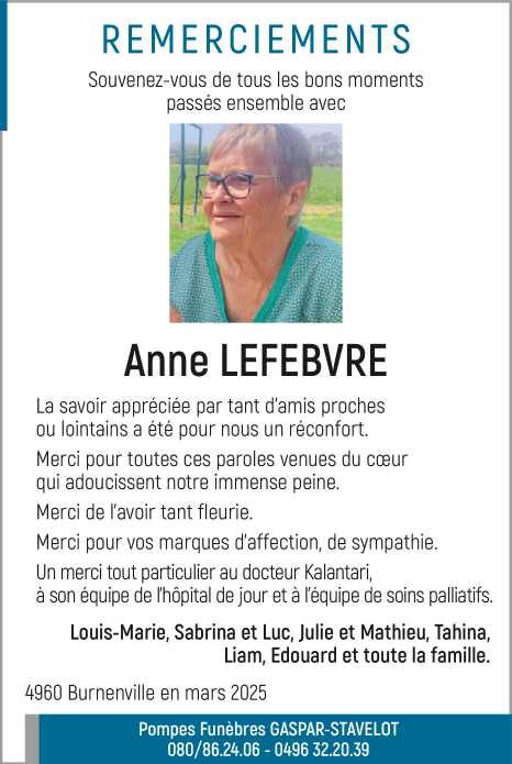 Décédée à Burnenville (4960) le mercredi 26 mars 2025 à l'âge de 68 ans