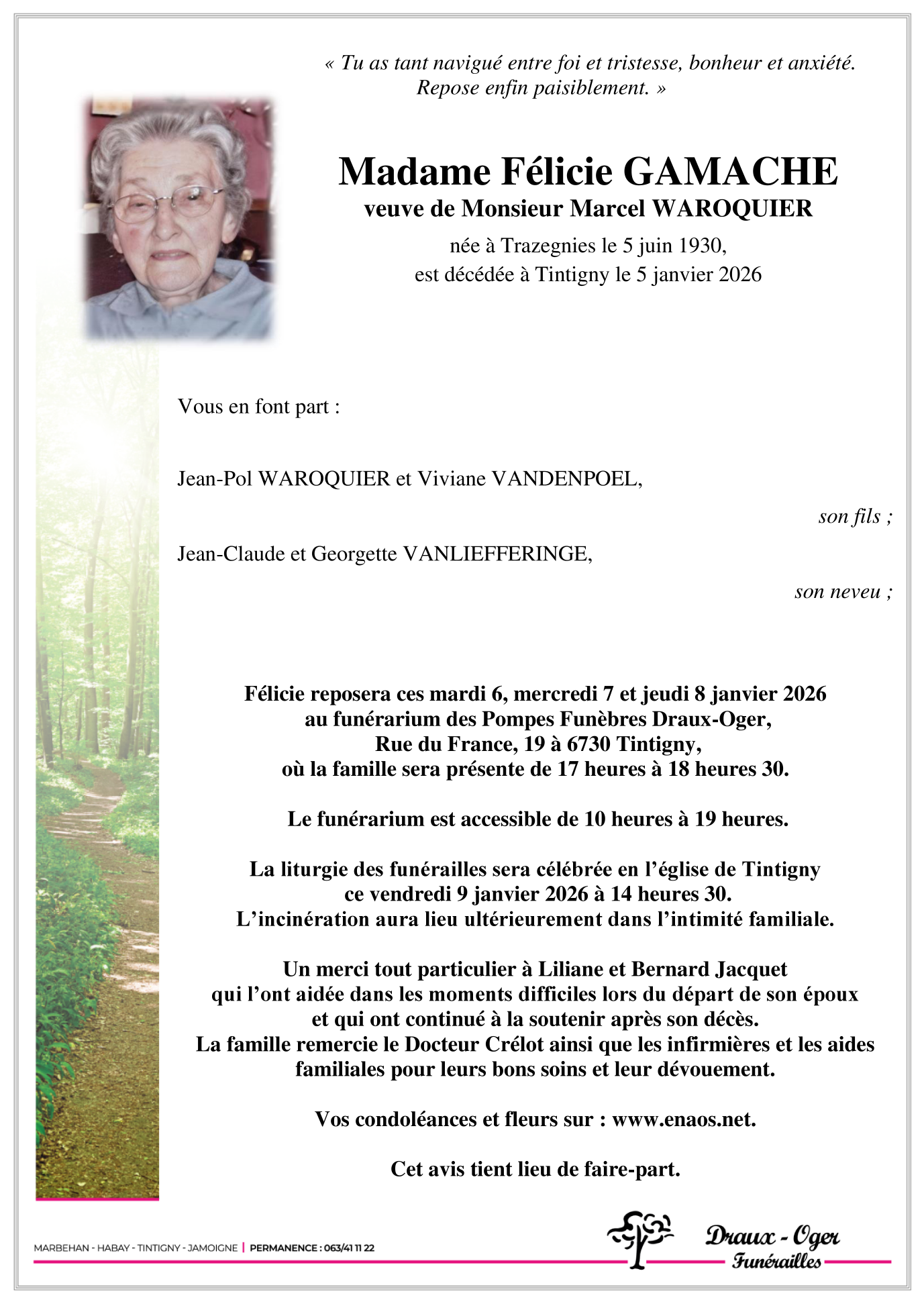 Décédée à Tintigny (6730) le lundi 5 janvier 2026 à l'âge de 95 ans