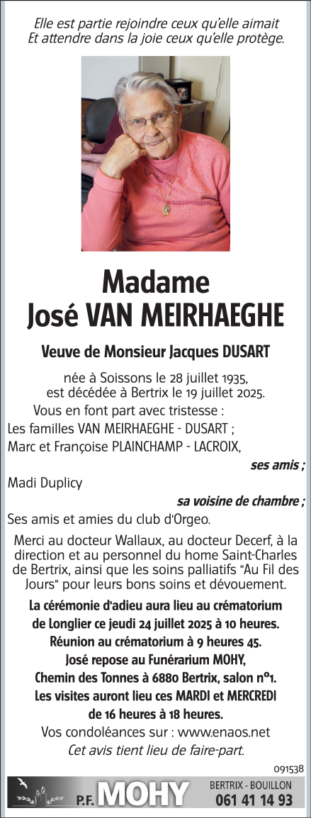 Overleden te Bertrix (6880) op zaterdag 19 juli 2025 op 89-jarige leeftijd