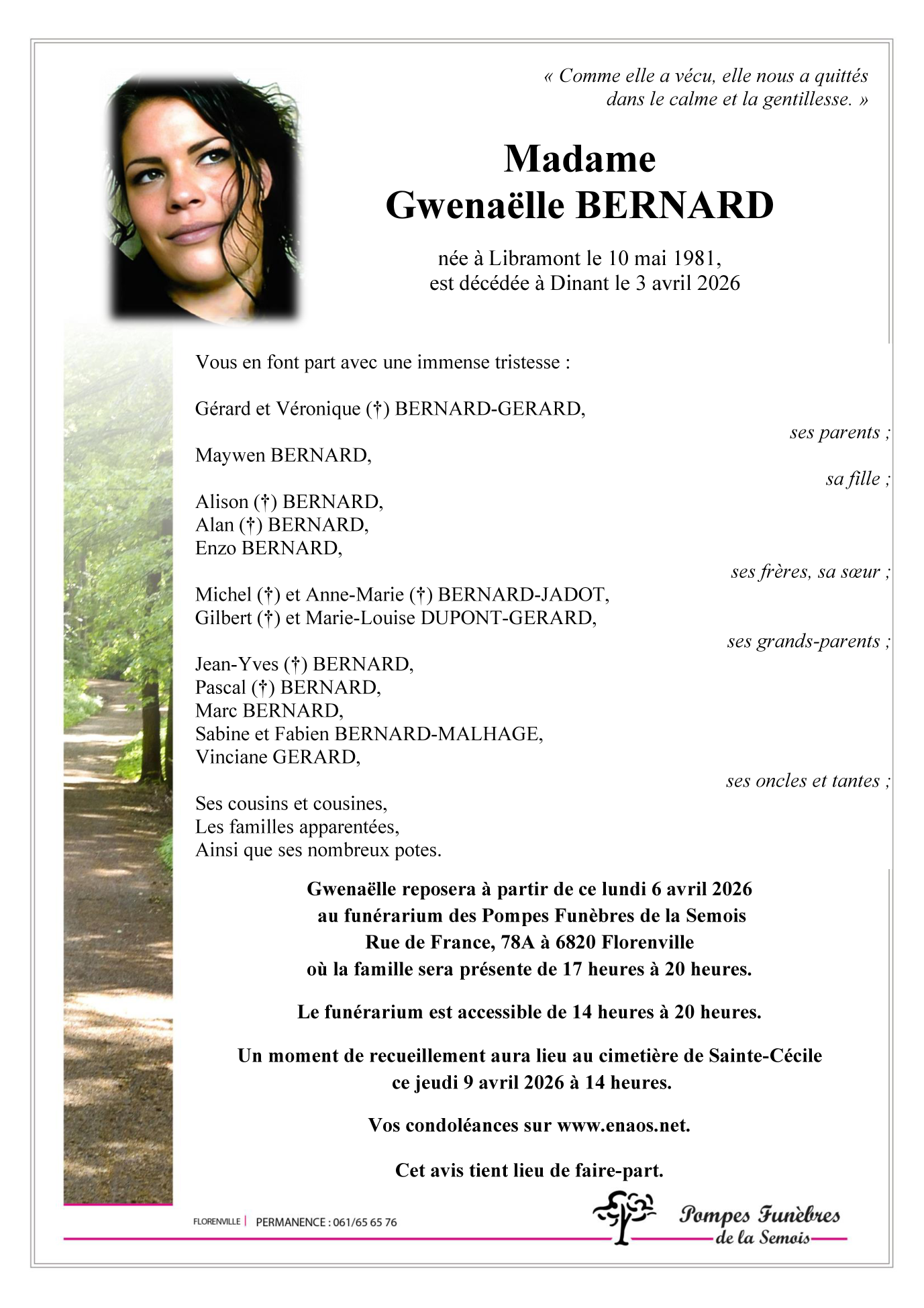 Décédée à Dinant (5500) le vendredi 3 avril 2026 à l'âge de 44 ans