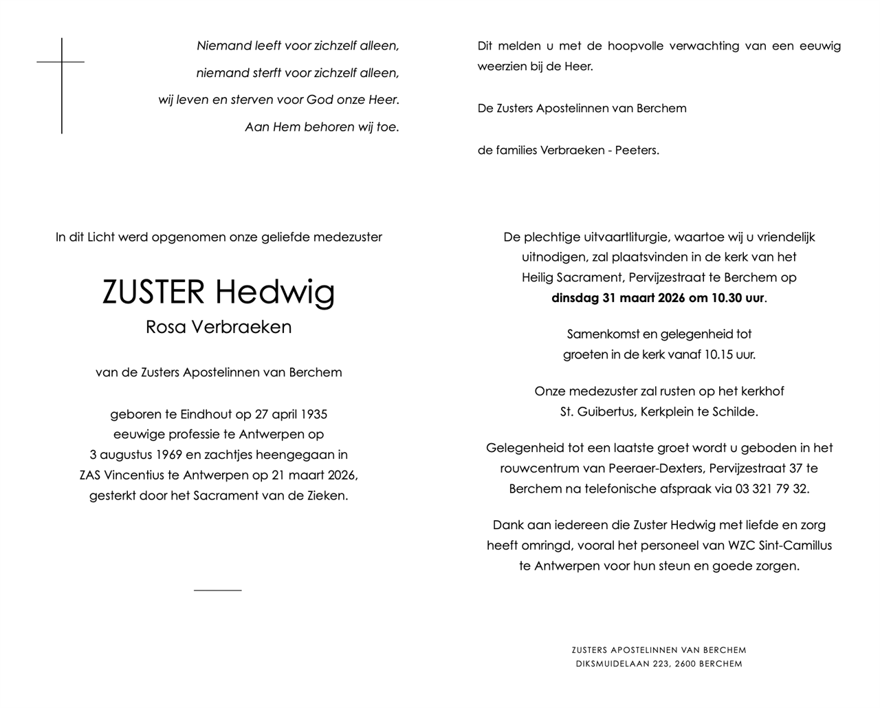 Fallecida en Antwerpen (2018) el sábado, 21 de marzo de 2026 a la edad de 90 años