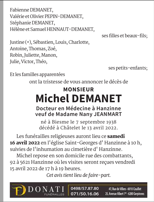 Décédé à Châtelet (6200) le mercredi 13 avril 2022 à l'âge de 83 ans