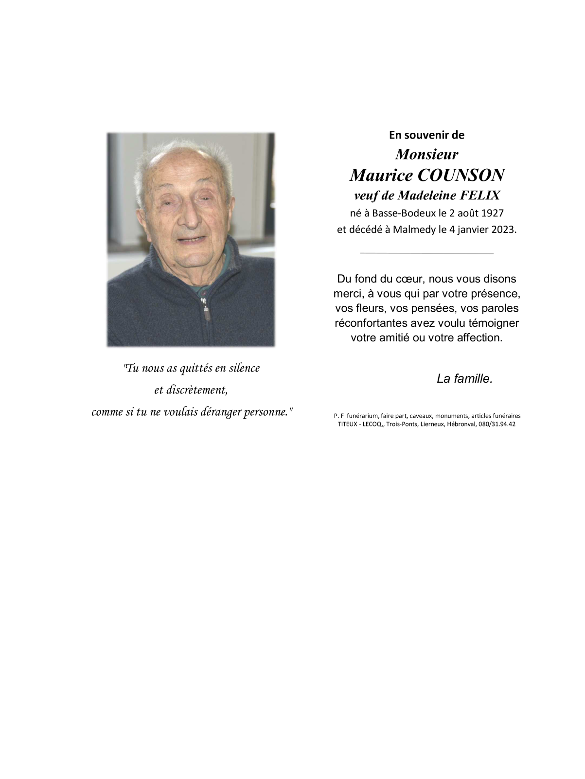 Décédé à Malmedy (4960) le mercredi 4 janvier 2023 à l'âge de 95 ans