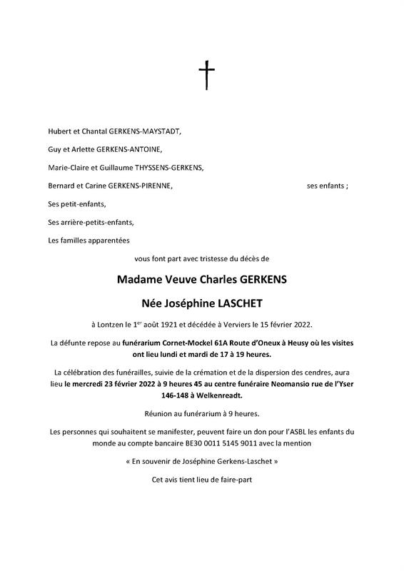 Décédée à Verviers (4800) le mardi 15 février 2022 à l'âge de 100 ans