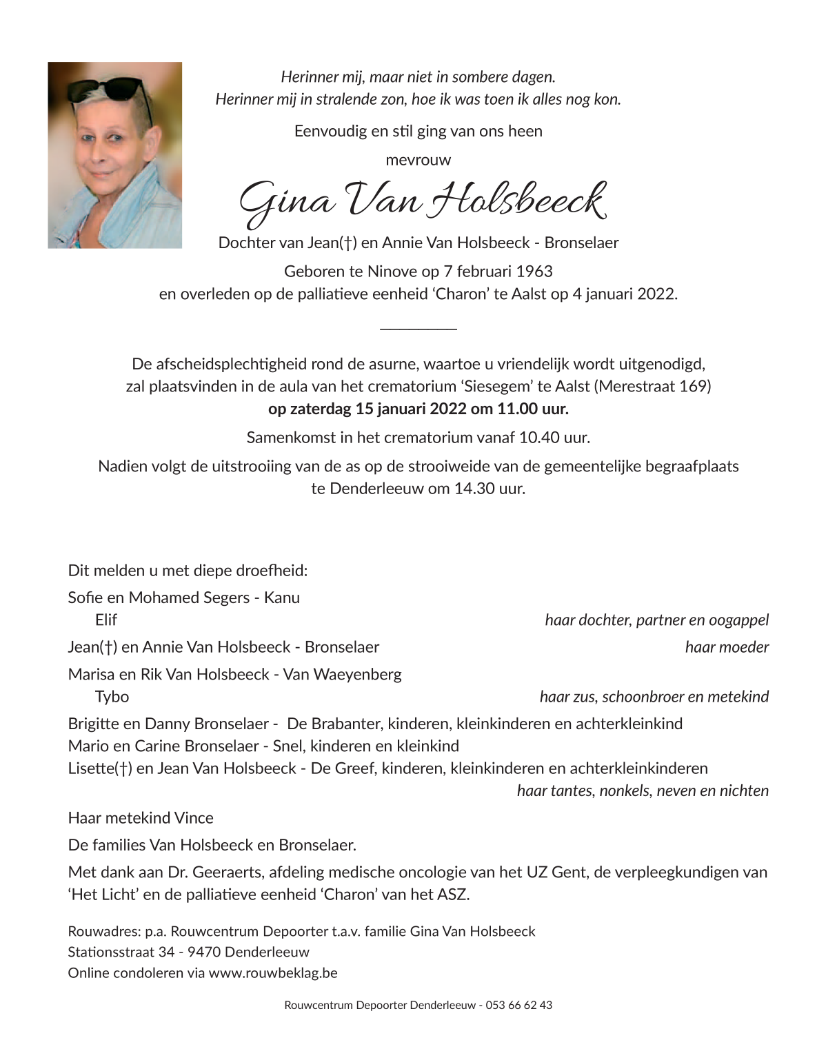 Décédée à Aalst (9300) le mardi 4 janvier 2022 à l'âge de 58 ans