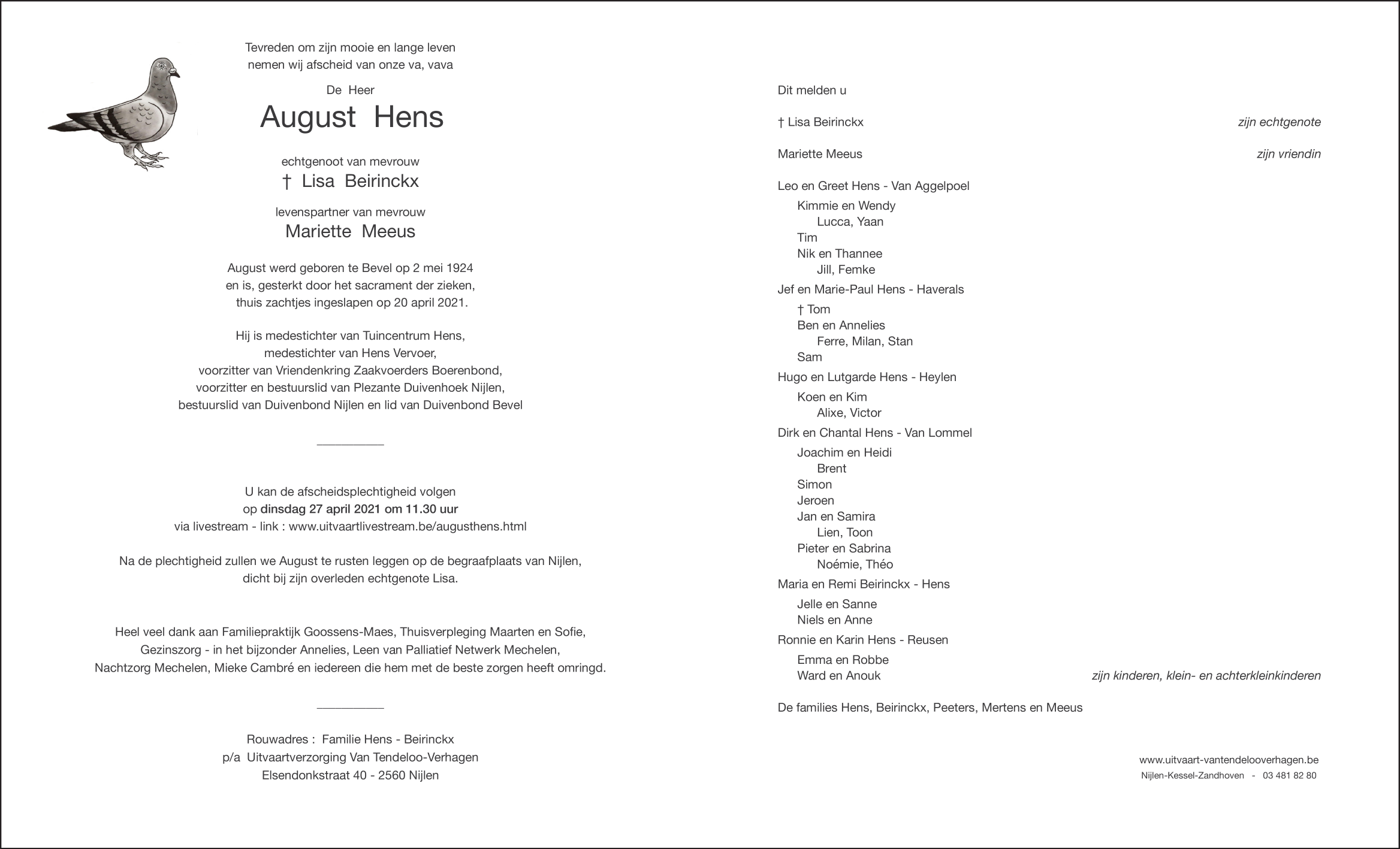 Décédé à Nijlen (2560) le mardi 20 avril 2021 à l'âge de 96 ans
