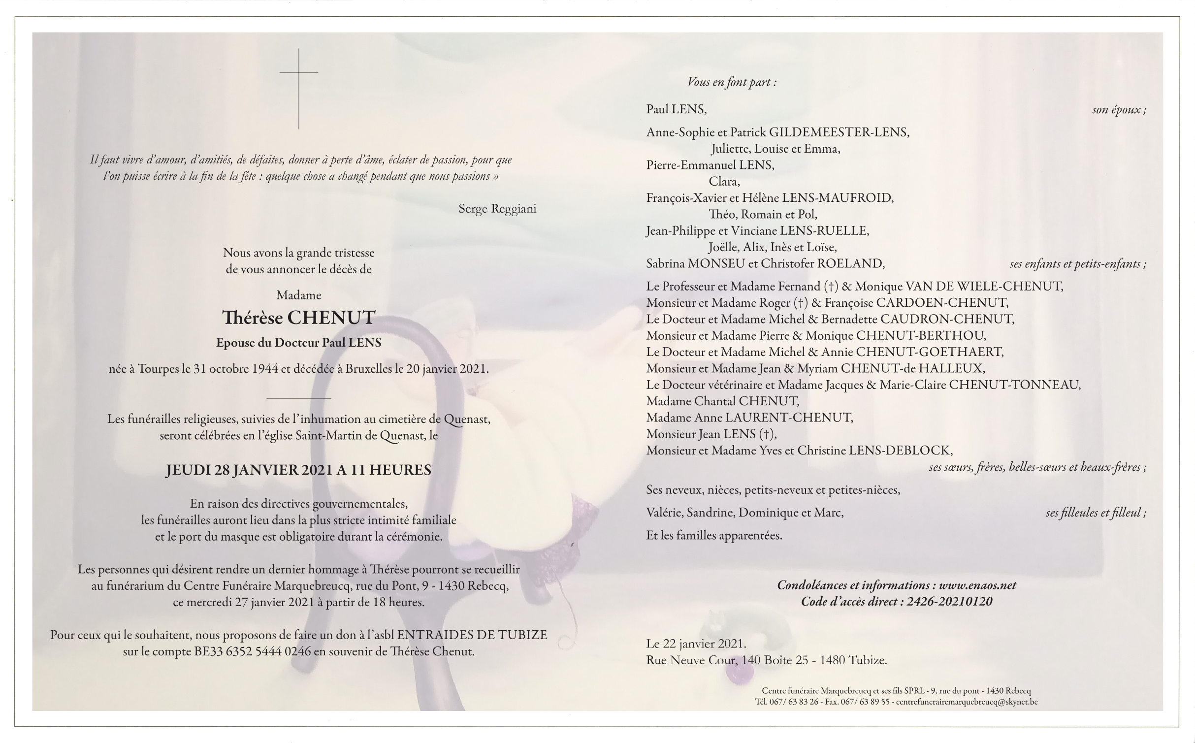 Décédée à Anderlecht (1070) le mercredi 20 janvier 2021 à l'âge de 76 ans