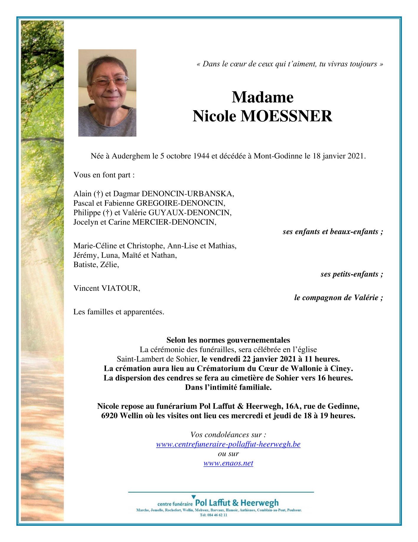 Décédée à Mont-Godinne (5530) le lundi 18 janvier 2021 à l'âge de 76 ans