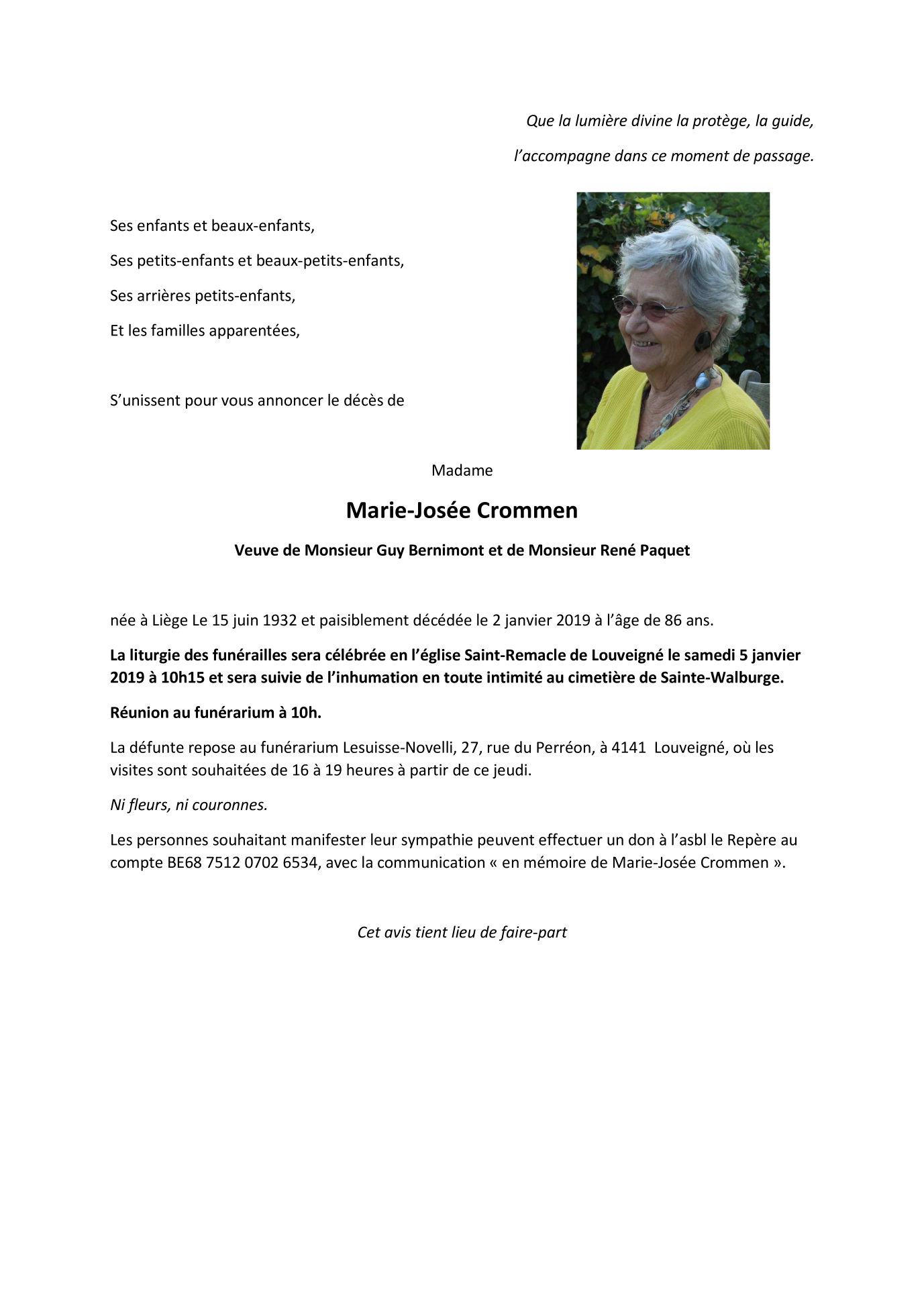 Fallecida en Sprimont (4140) el miércoles, 2 de enero de 2019 a la edad de 86 años