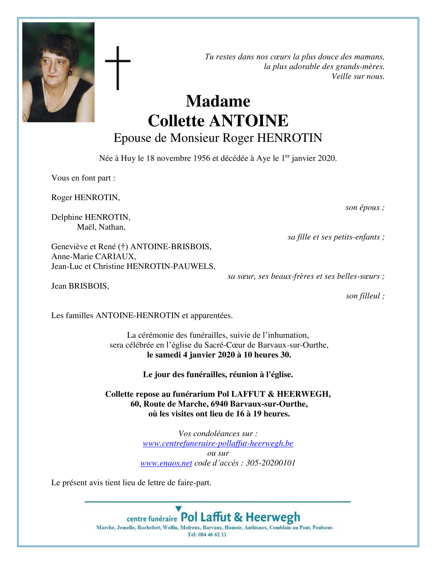 Fallecida en Aye (6900) el miércoles, 1 de enero de 2020 a la edad de 63 años