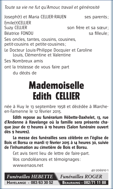 Fallecida en Marche-en-Famenne (6900) el jueves, 12 de febrero de 2015 a la edad de 56 años