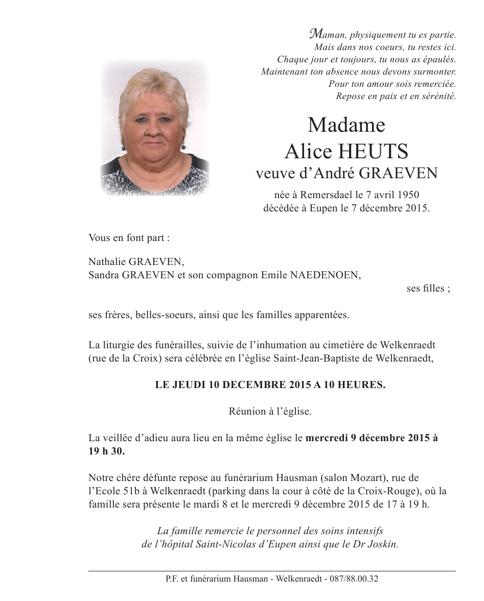 Décédée à Eupen (4700) le lundi 7 décembre 2015 à l'âge de 65 ans