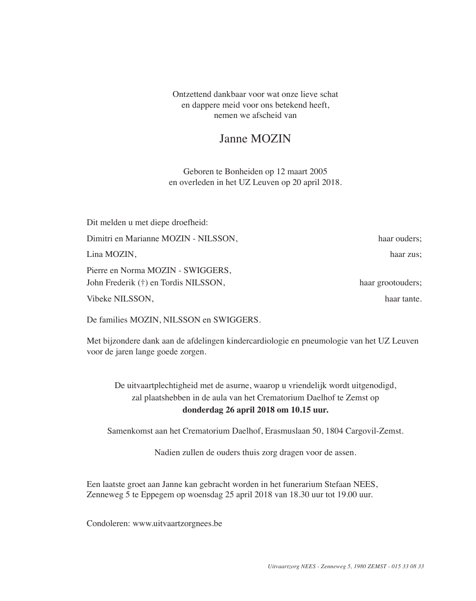 Fallecida en Leuven (3000) el viernes, 20 de abril de 2018 a la edad de 13 años