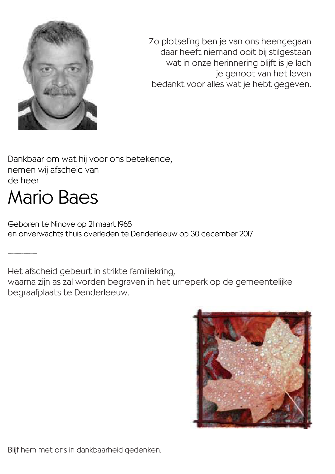 Décédé à Denderleeuw (9470) le samedi 30 décembre 2017 à l'âge de 52 ans