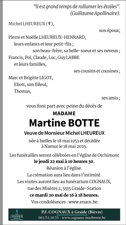 Fallecida en Namur (5000) el domingo, 18 de mayo de 2025 a la edad de 72 años