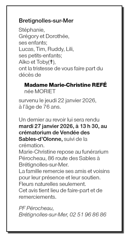 Died in Bretignolles-sur-Mer (85470, France) on 22 January 2026 at the age of 76 years