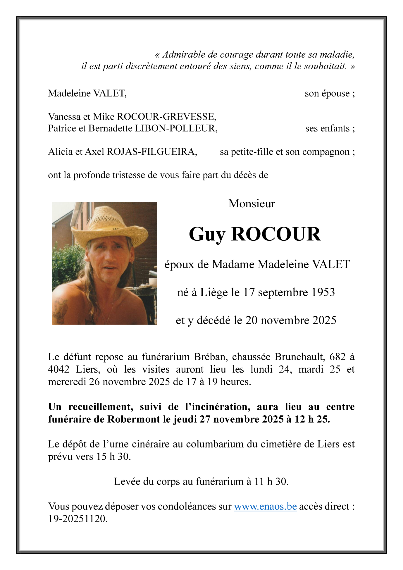 Died in Liège (4000) on 20 November 2025 at the age of 72 years