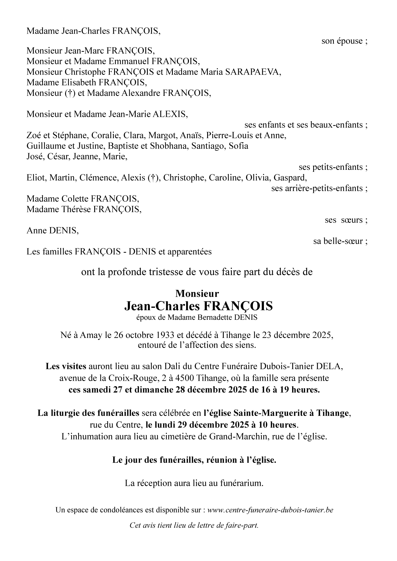 Fallecido en Tihange (4500) el martes, 23 de diciembre de 2025 a la edad de 92 años