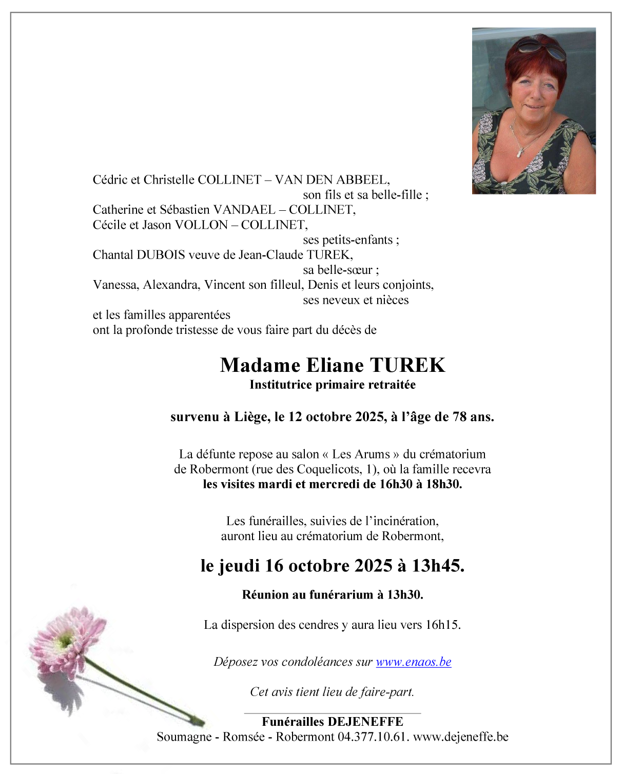 Décédée à Liège (4000) le dimanche 12 octobre 2025 à l'âge de 78 ans