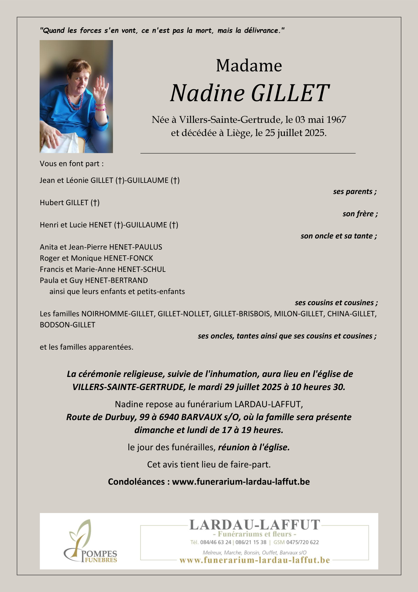 Née à Villers-Sainte-Gertrude (6941) le mercredi 3 mai 1967