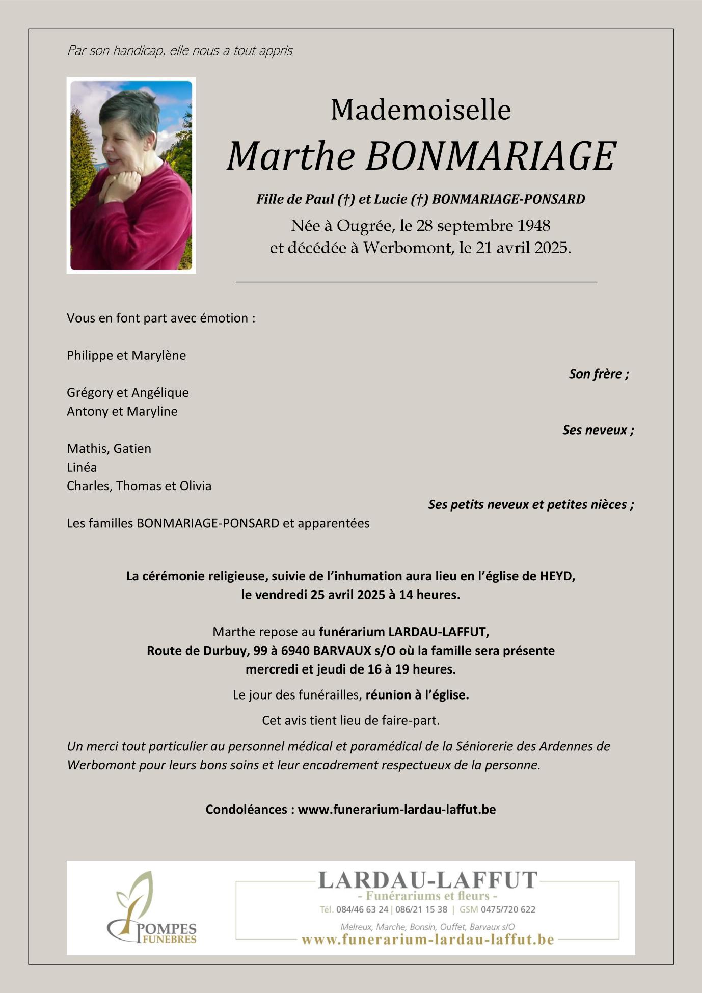 Fallecida en Werbomont (4190) el lunes, 21 de abril de 2025 a la edad de 76 años