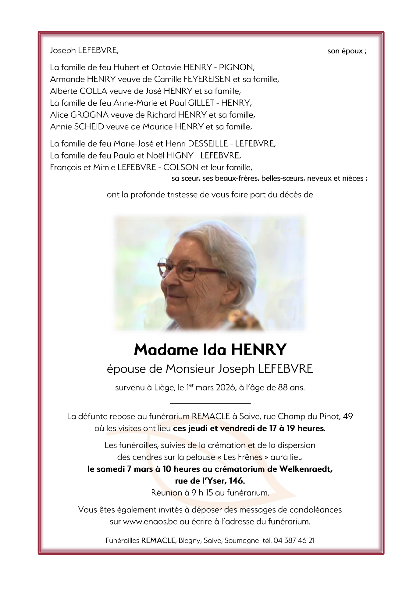 Décédée à Liège (4000) le dimanche 1 mars 2026 à l'âge de 88 ans