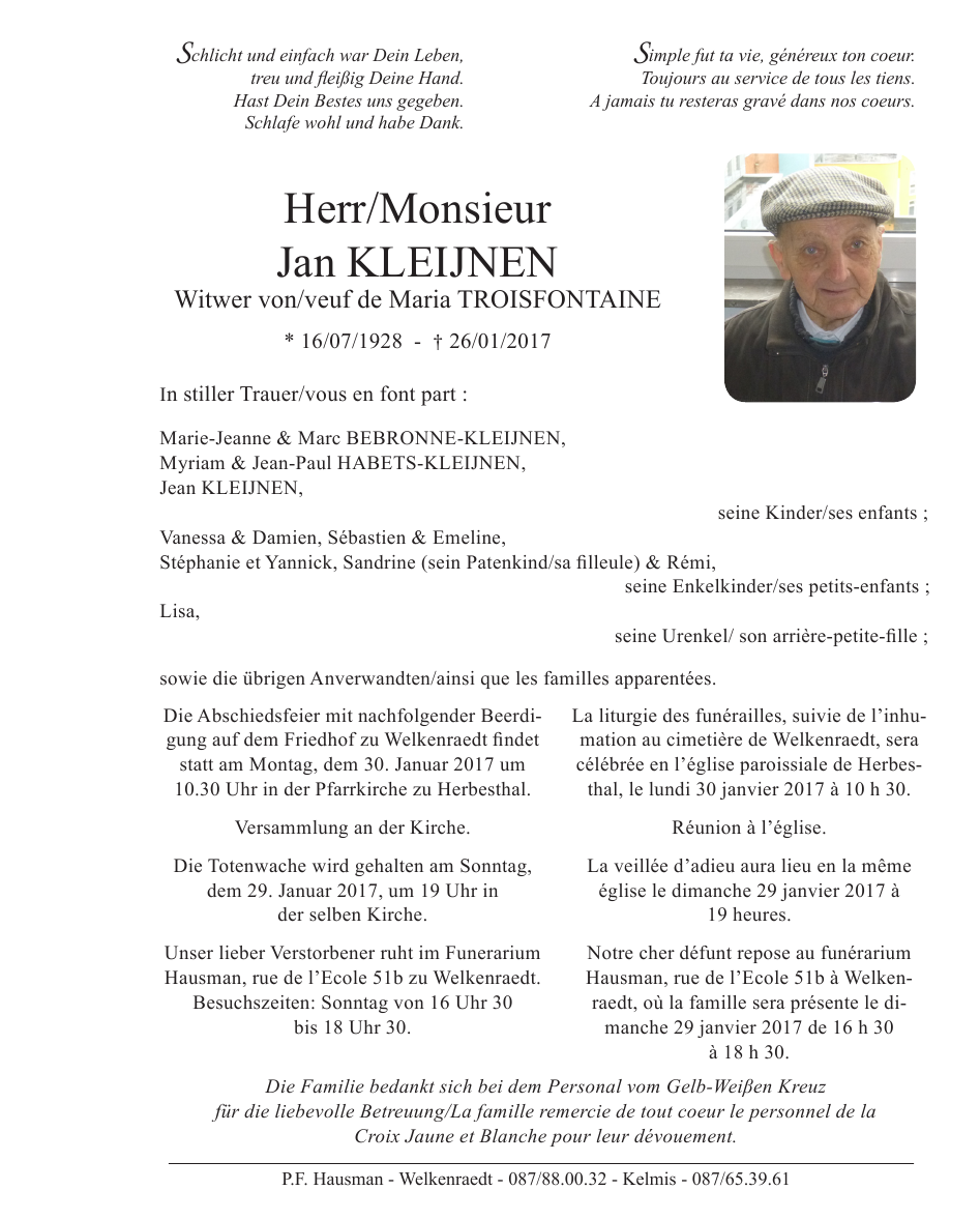 Died in Eupen (4700) on 26 January 2017 at the age of 88 years