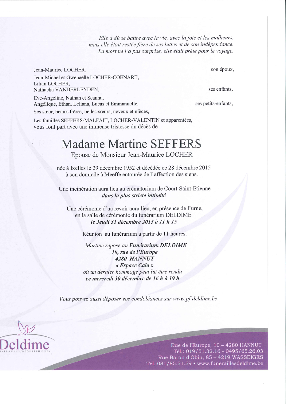 Décédée à Meeffe (4219) le lundi 28 décembre 2015 à l'âge de 62 ans