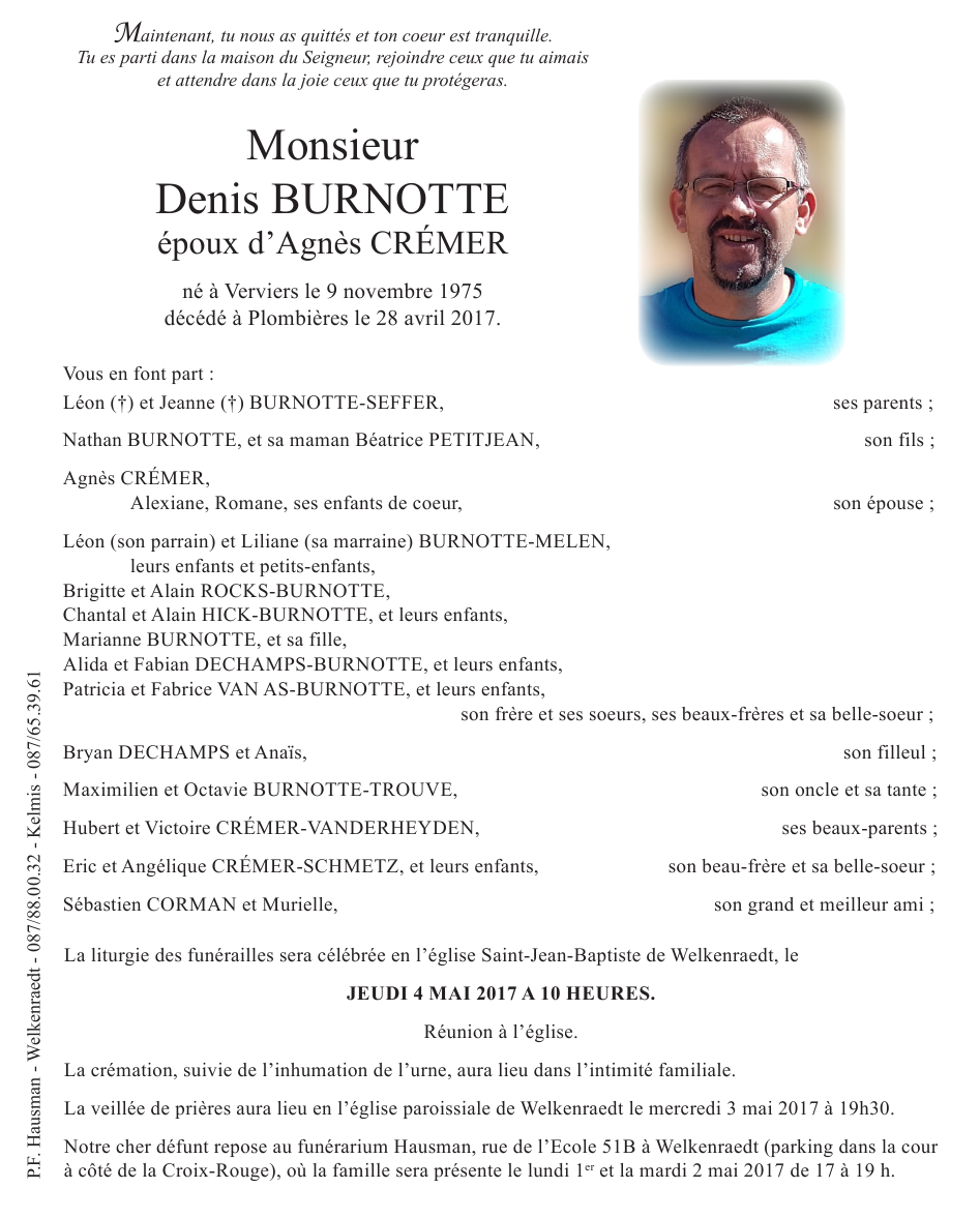 Décédé à Montzen (4850) le vendredi 28 avril 2017 à l'âge de 41 ans