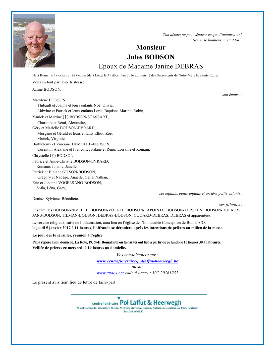 Décédé à Liège (4000) le samedi 31 décembre 2016 à l'âge de 89 ans