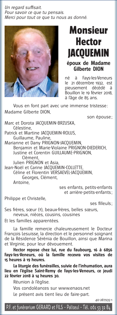 Décédé à Bouillon (6830) le lundi 19 février 2018 à l'âge de 85 ans