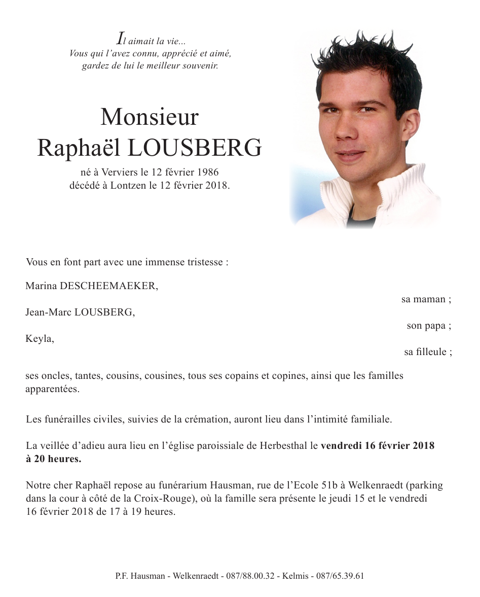 Died in Lontzen (4710) on 12 February 2018 at the age of 32 years