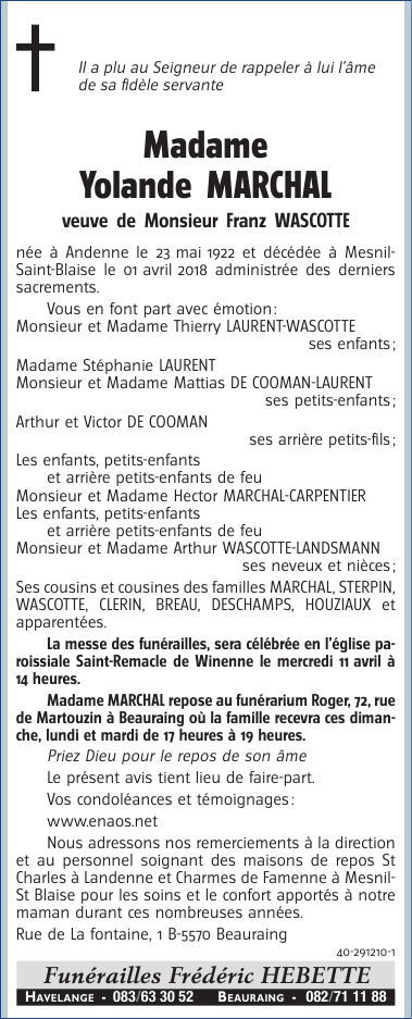 Died in Houyet (5560) on 01 April 2018 at the age of 95 years
