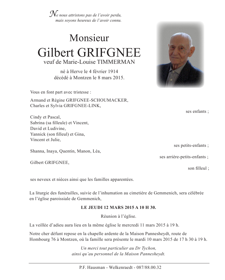 Décédé à Montzen (4850) le dimanche 8 mars 2015 à l'âge de 101 ans