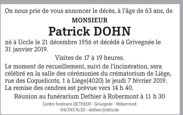 Décédé à Liège (4000) le jeudi 31 janvier 2019 à l'âge de 62 ans