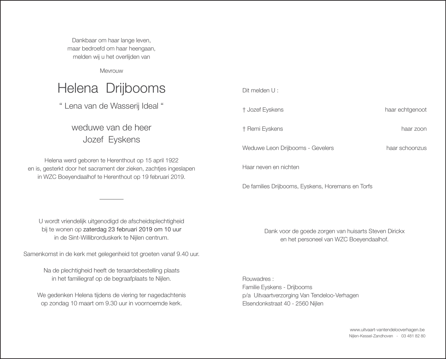 Overleden te Herenthout (2270) op dinsdag 19 februari 2019 op 96-jarige leeftijd