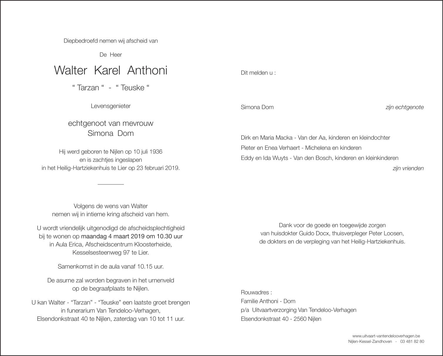 Overleden te Lier (2500) op zaterdag 23 februari 2019 op 82-jarige leeftijd