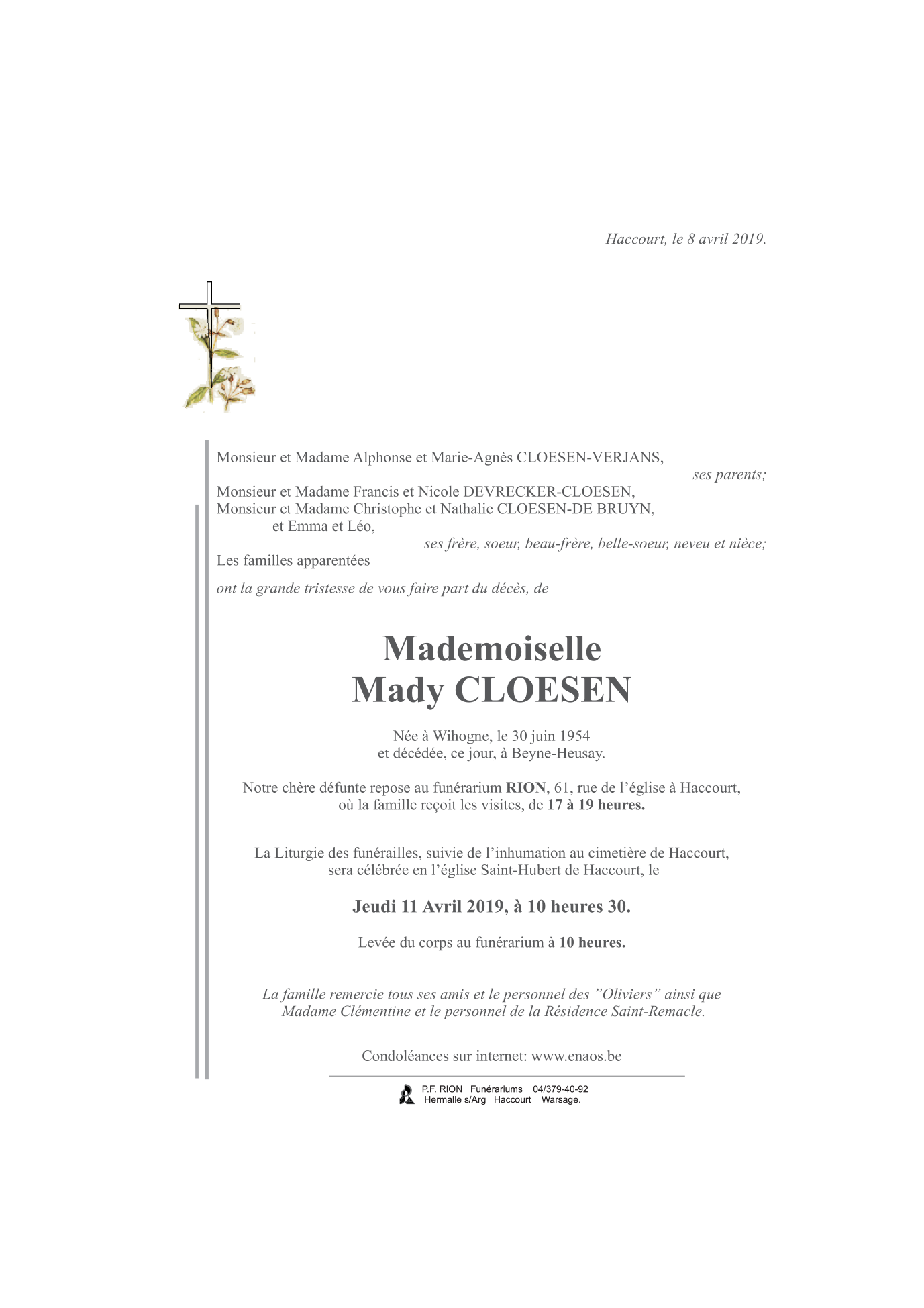 Décédée à Beyne-Heusay (4610) le lundi 8 avril 2019 à l'âge de 64 ans
