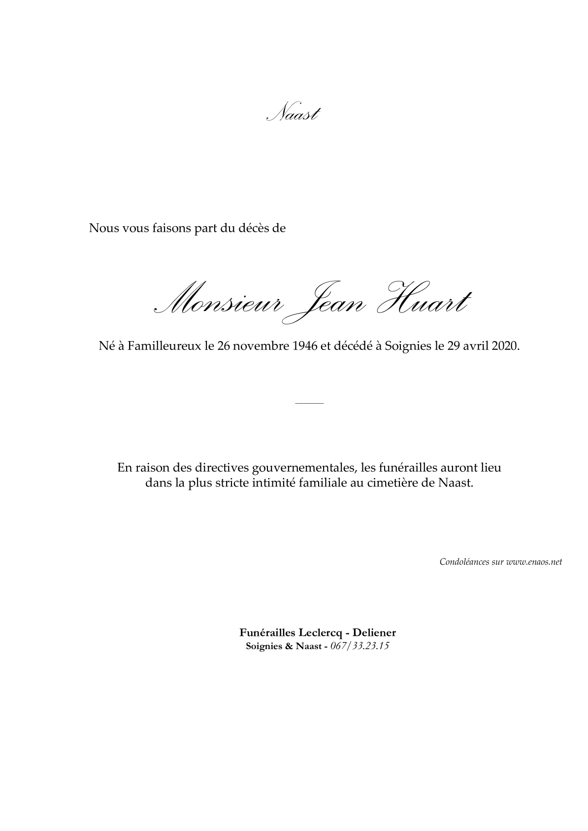Décédé à Soignies (7060) le mercredi 29 avril 2020 à l'âge de 73 ans