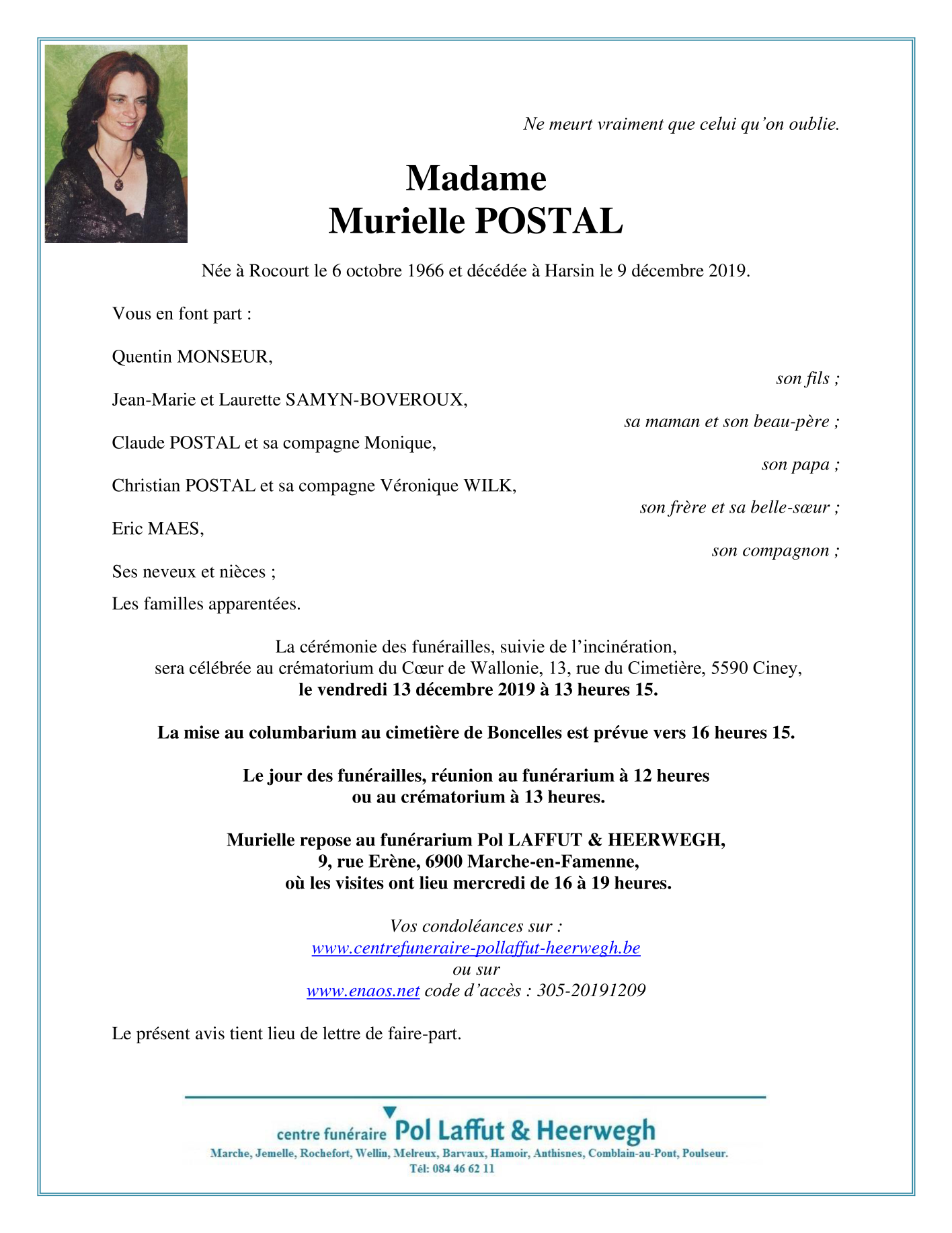 Fallecida en Harsin (6950) el lunes, 9 de diciembre de 2019 a la edad de 53 años
