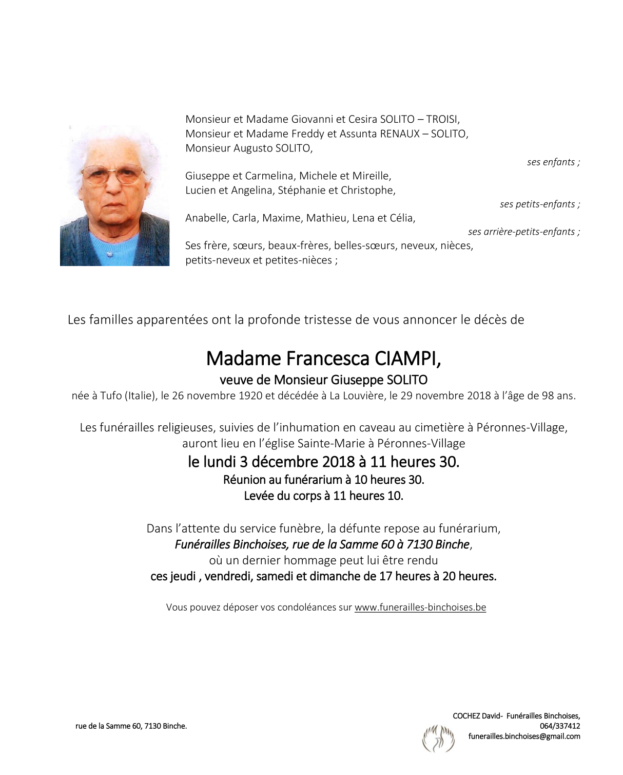 Décédée à La Louvière (7100) le jeudi 29 novembre 2018 à l'âge de 98 ans