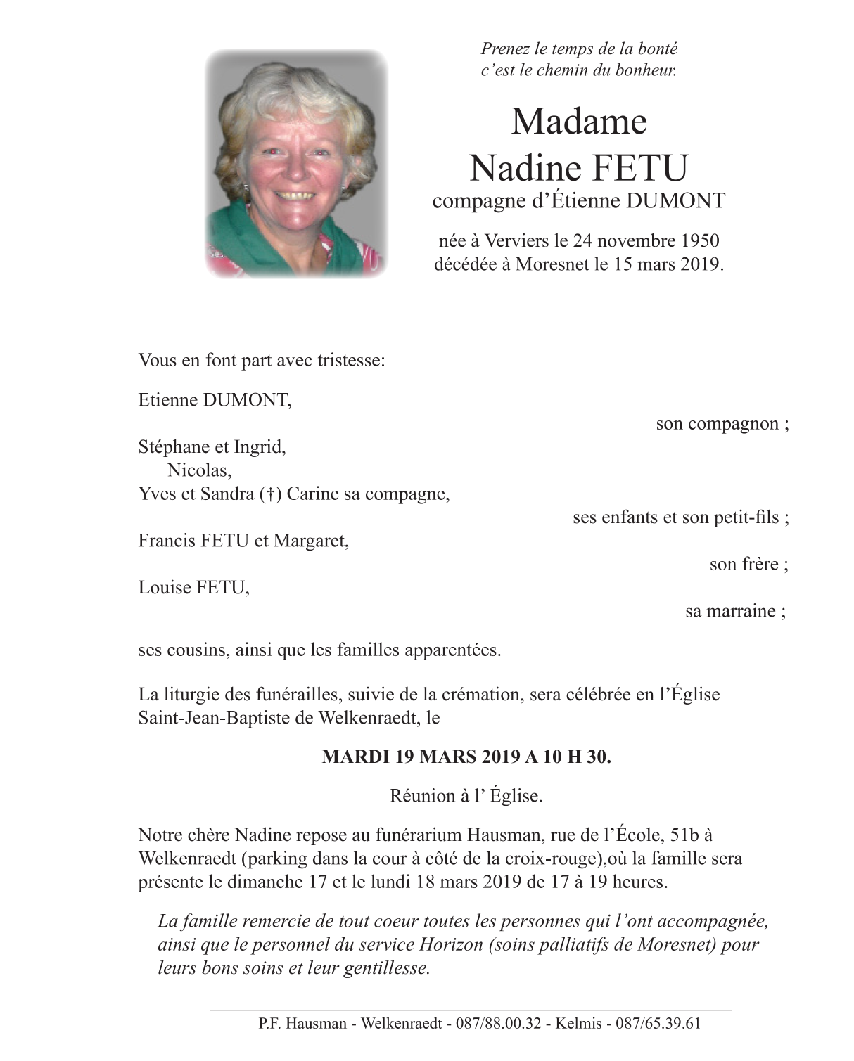 Fallecida en Moresnet (4850) el viernes, 15 de marzo de 2019 a la edad de 68 años