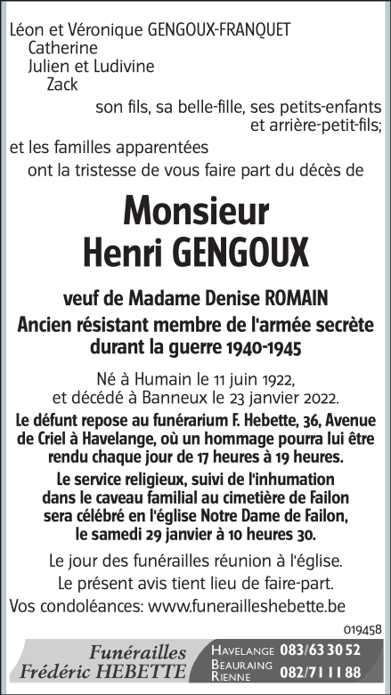 Died in Louveigné (4141) on 23 January 2022 at the age of 99 years